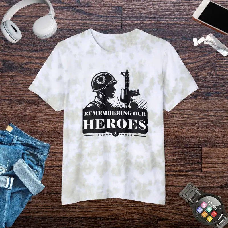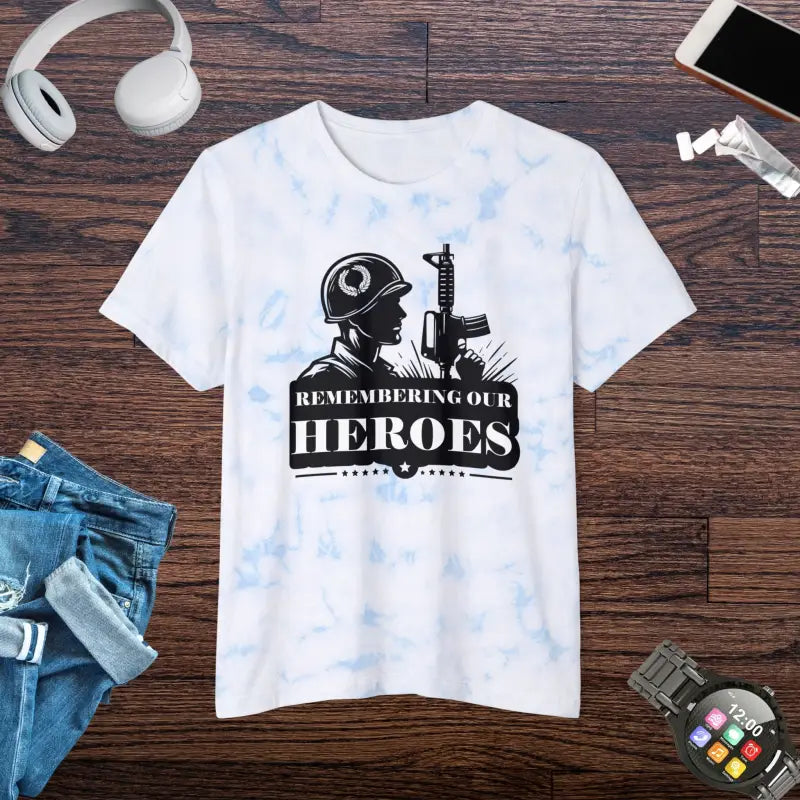 Print: Swirling tie-dye with statement graphics remembering our heroes, with each shirt displaying its own unique pattern.