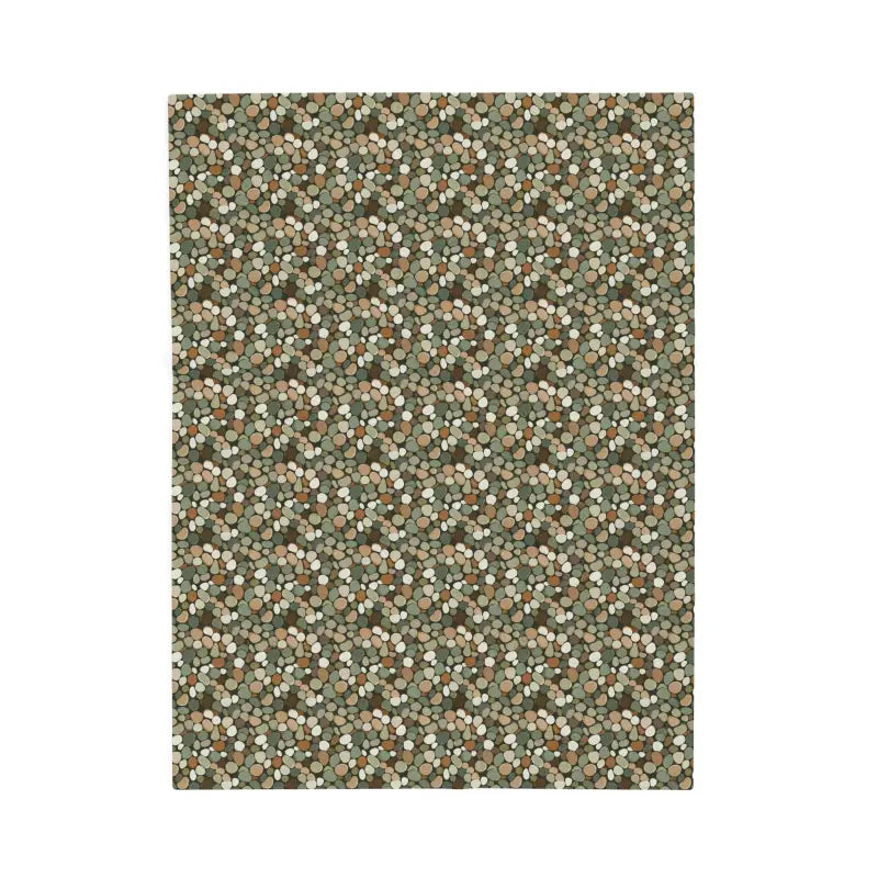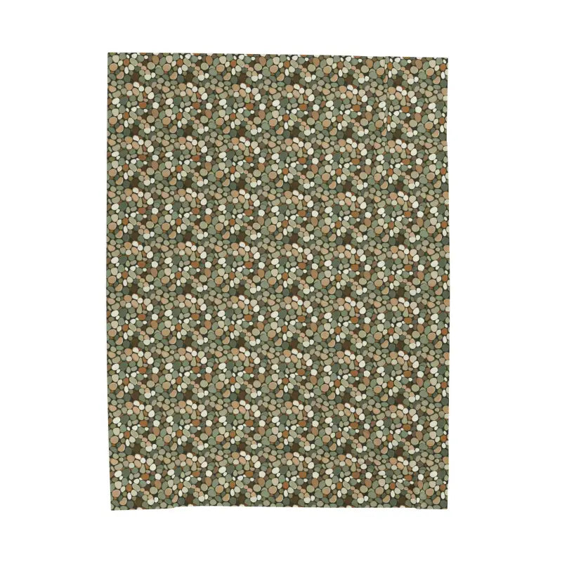 The tightly arranged pebble pattern showcases gorgeous muted greens, warm browns, and soft cream tones that create visual depth and texture. One side displays vibrant high-detail printing while the reverse offers a smooth pale finish perfect for layering.