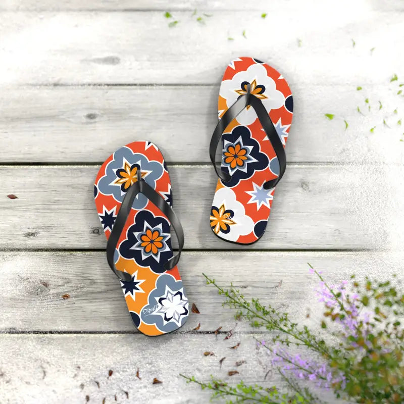 Catch the wave of summer vibes with this energetic pair of flip flops. Say goodbye to ordinary and hello to extraordinary—your seasonal adventures await, and these striking sandals are just the ticket to stride into the sun with confidence. So why wait? Step up your summer fashion game today and transform your footwear collection into a radiant masterpiece that reflects your personality. Grab your pair of Vibrant Geometric Flip Flops now and become the owner of the season's hottest trend!