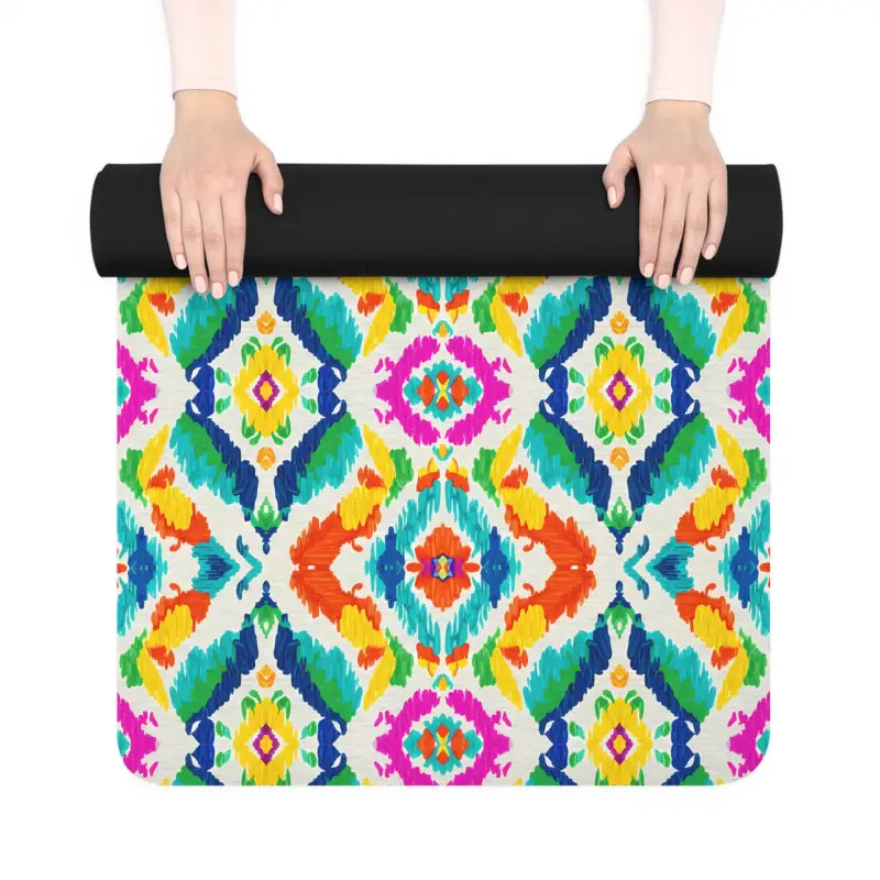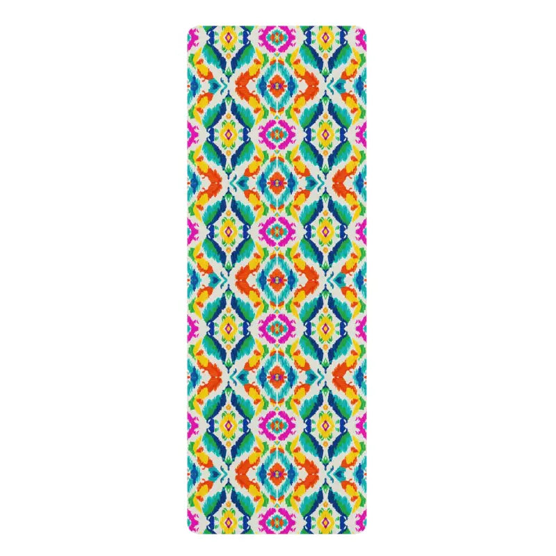 Mesmerizing ikat patterns swirl in brilliant hues that energize your entire practice space and spark joy with every unroll.