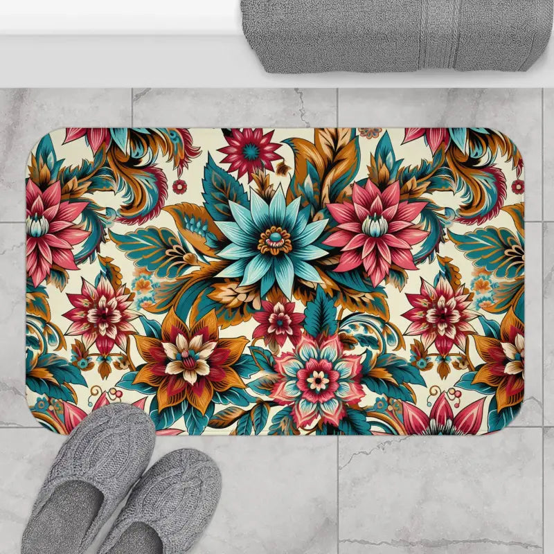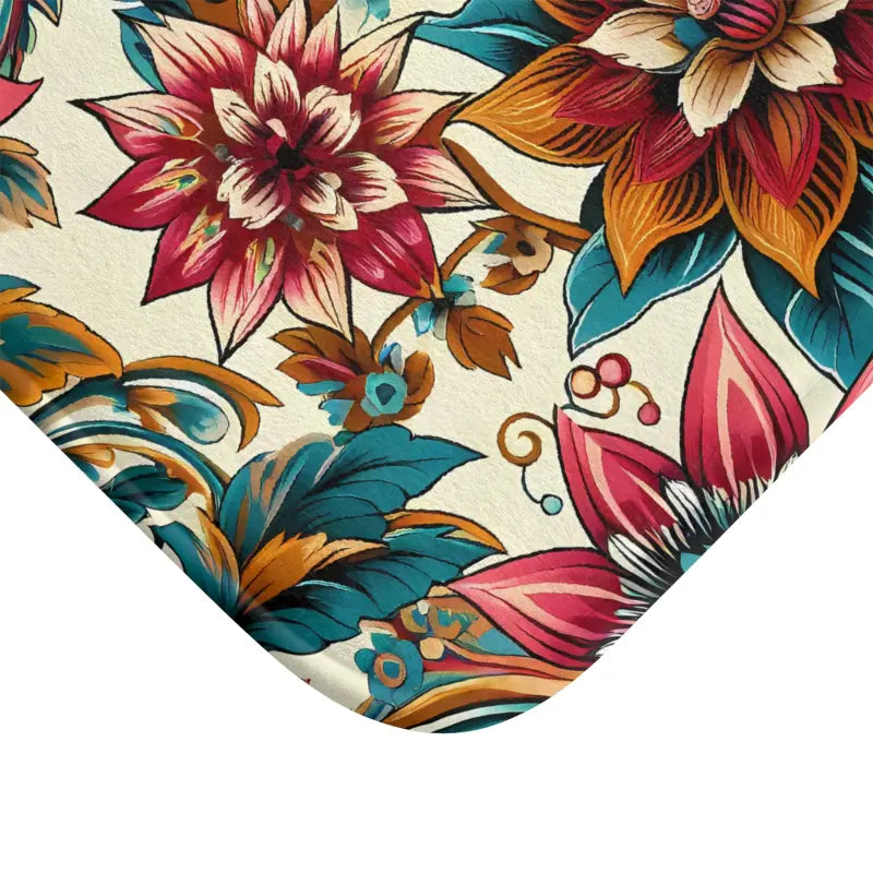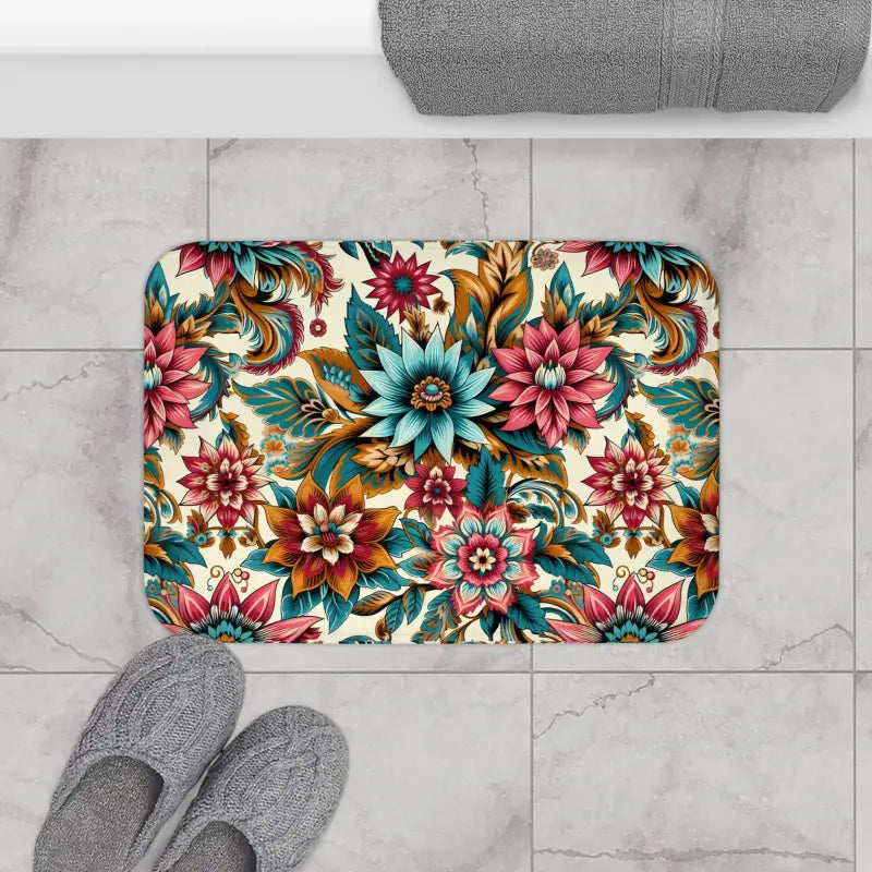Vibrant large flower pattern, Bath Mat. Monochromatic large floral pattern, Bath Mat. Beautiful mat for the most private room in one's house. This bath mat is as practical as it is stylish - the anti-slip backing keeps the bath mat firmly in place and reduces the risk of slipping.