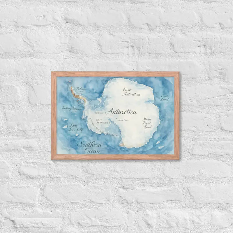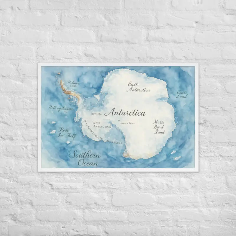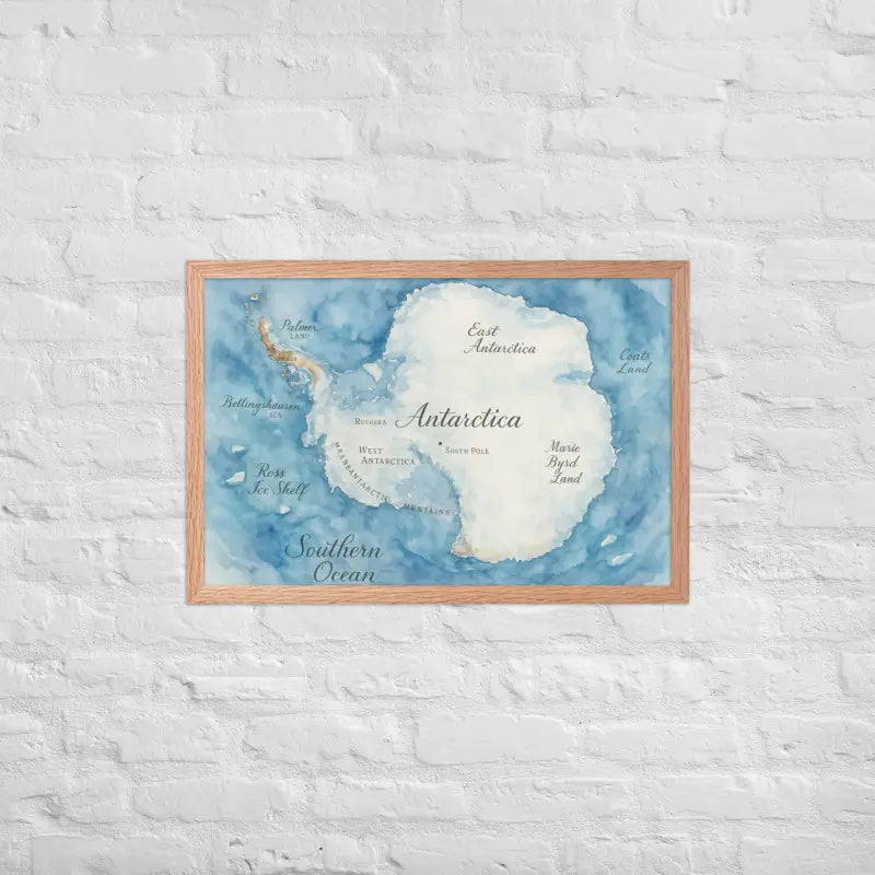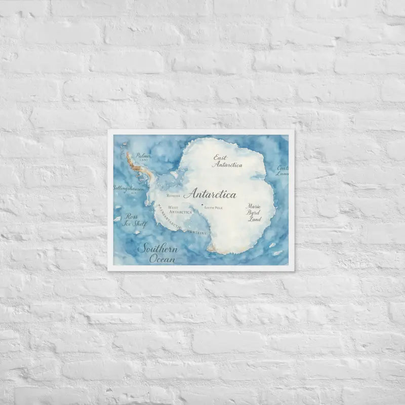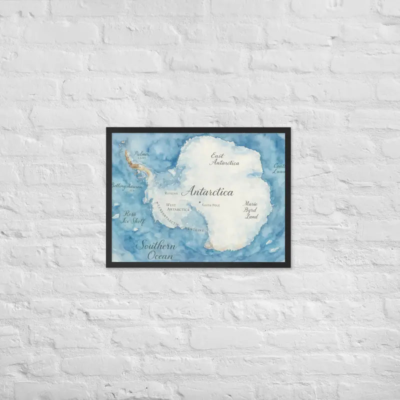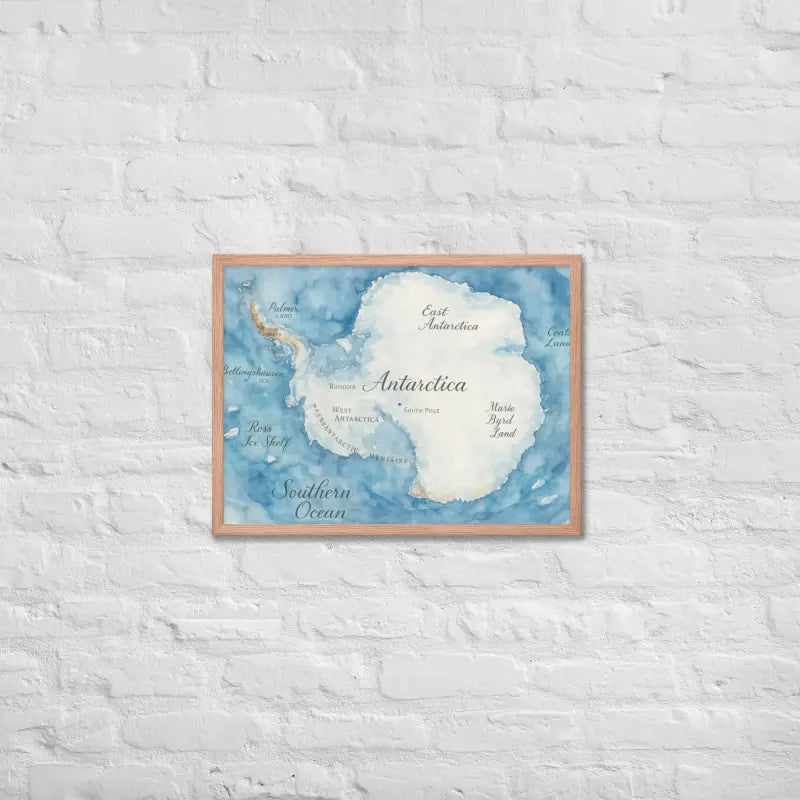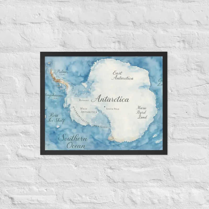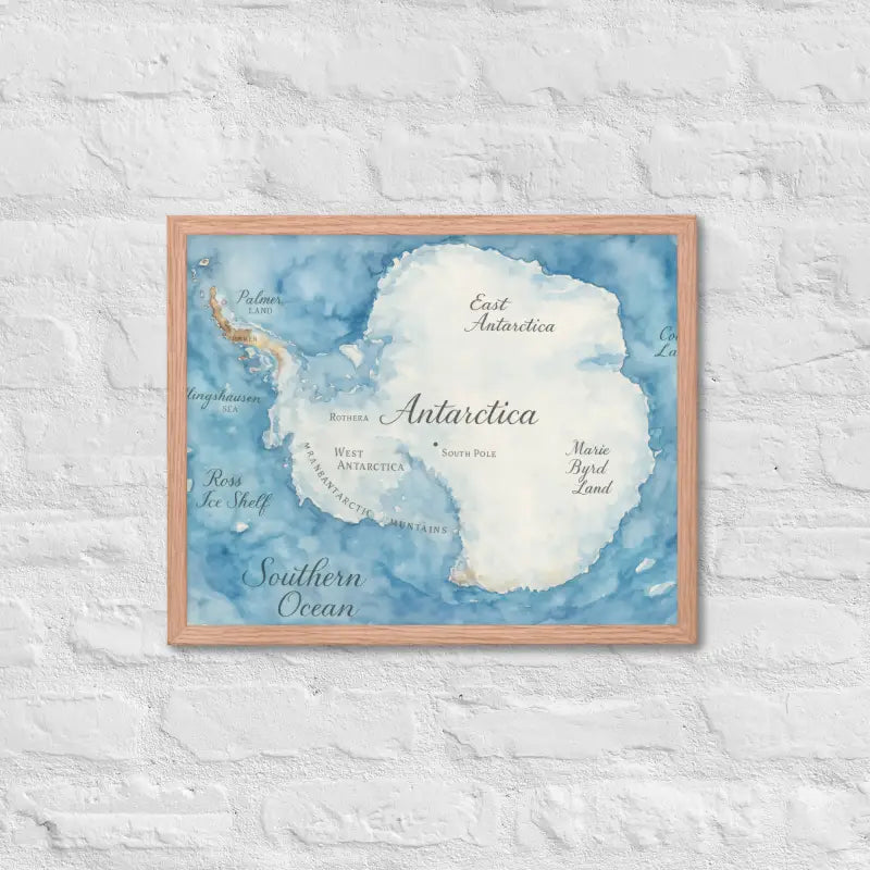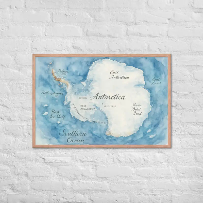 Bring the frozen beauty of the South Pole to your walls with this vivid watercolor map framed poster that highlights Antarctica’s region names in soft, dreamy hues and crisp, modern lines.