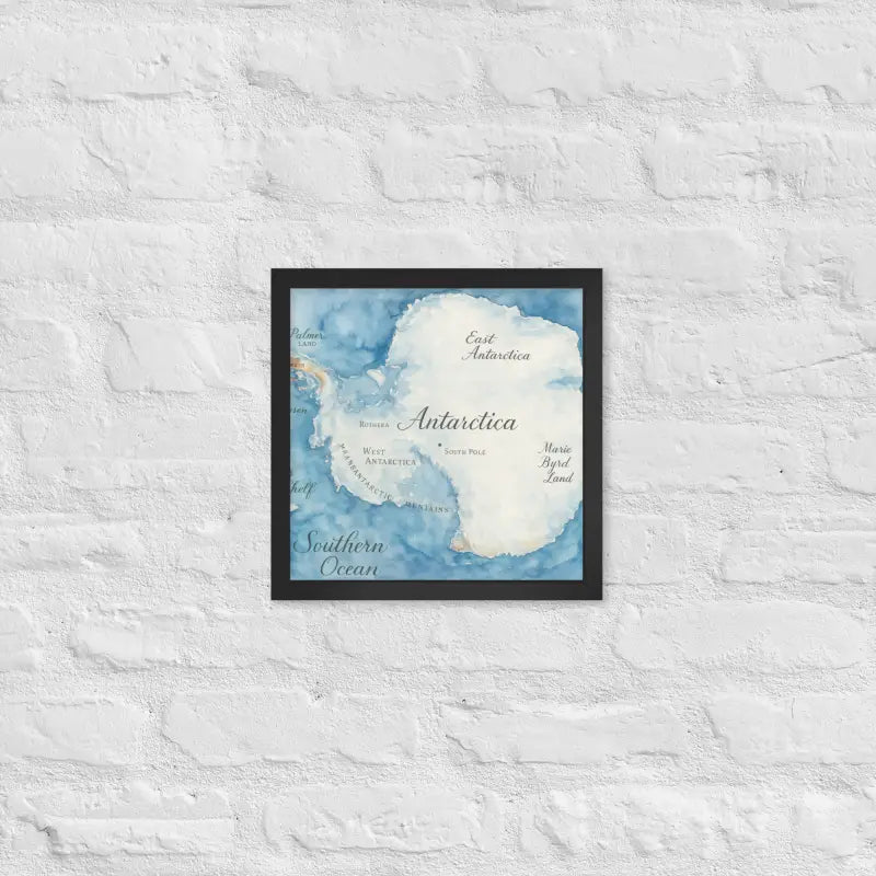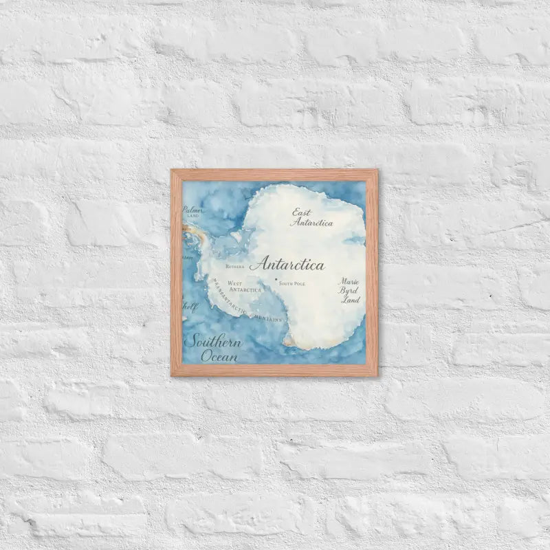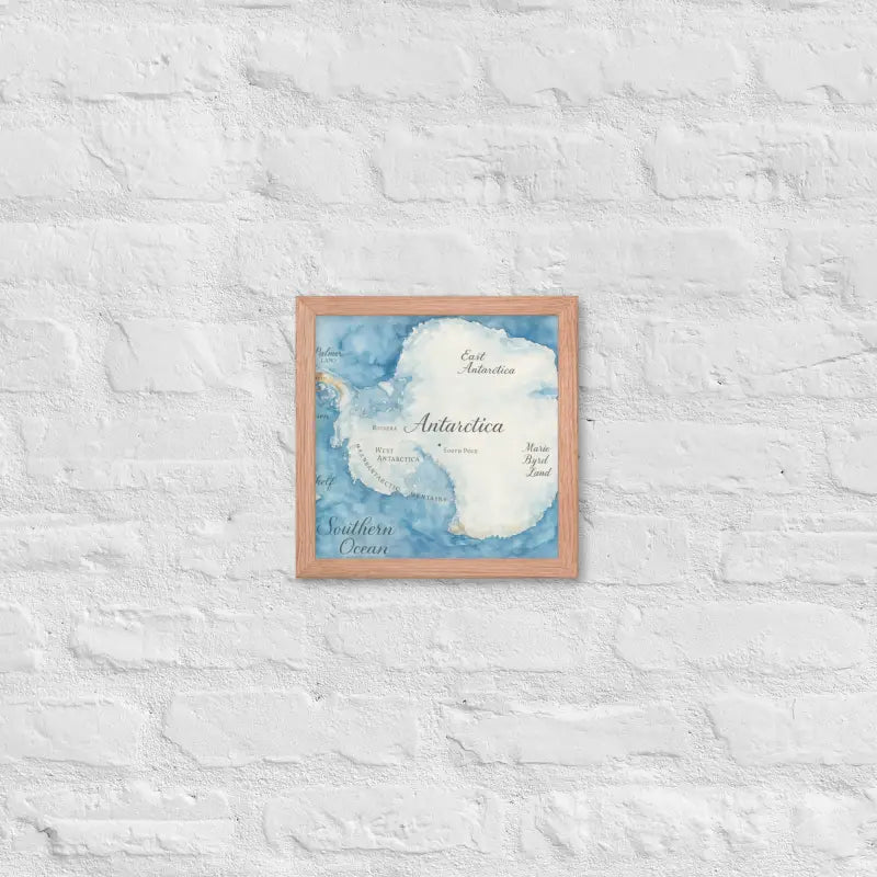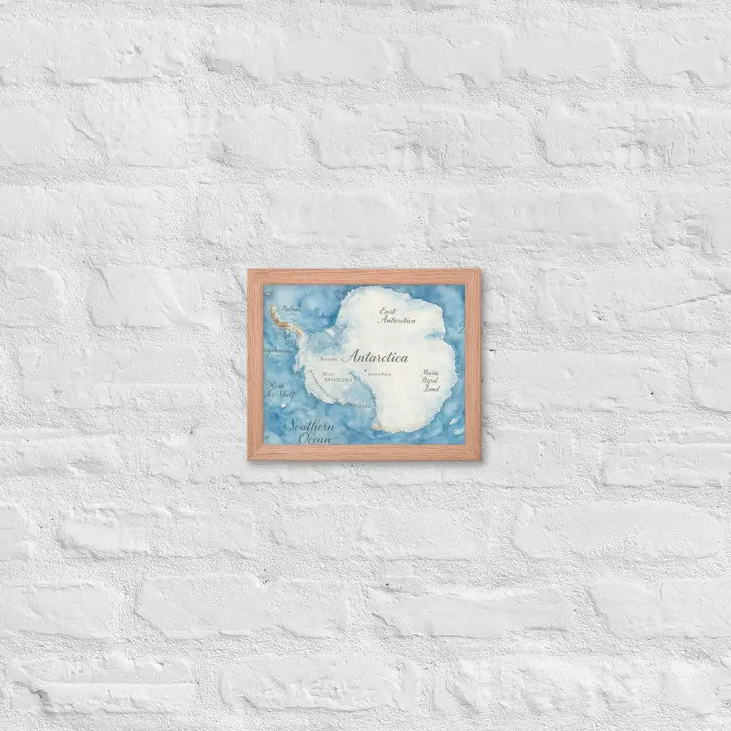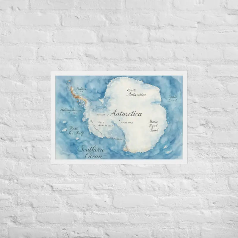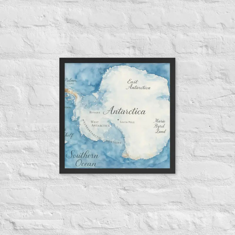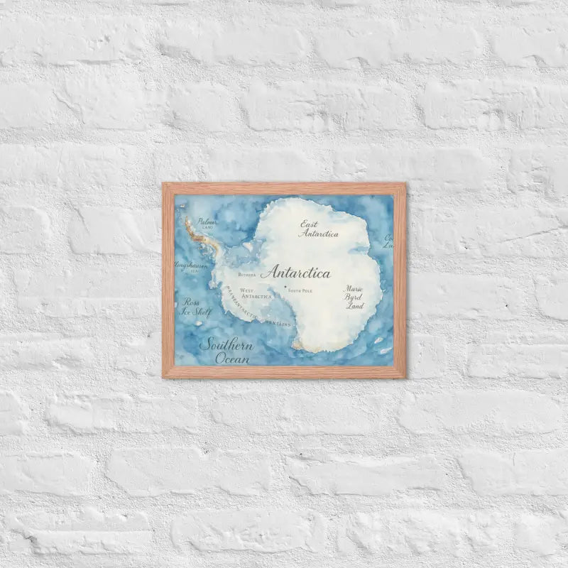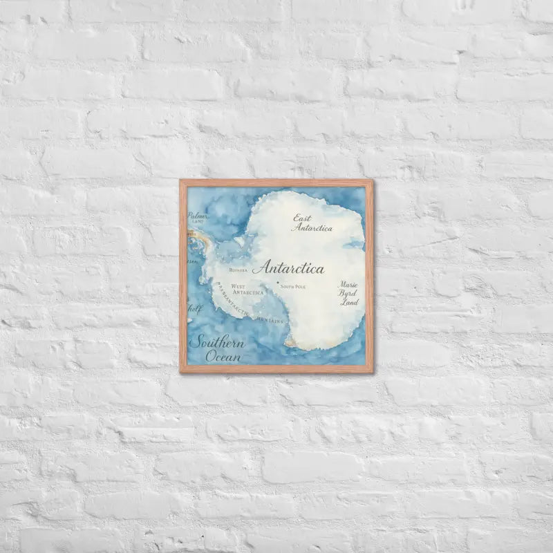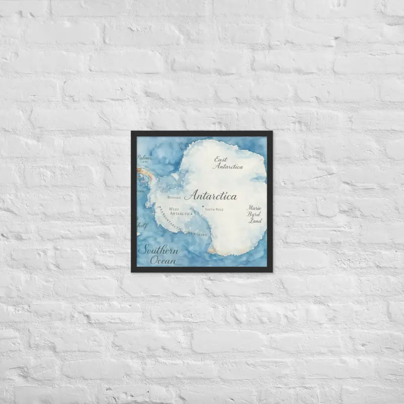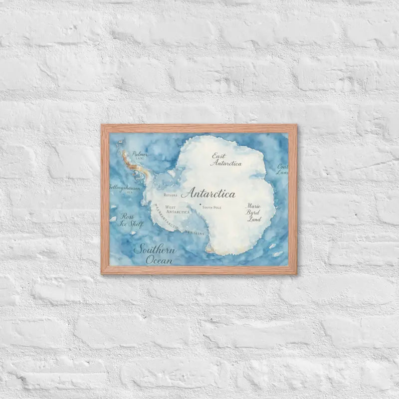 Bring the frozen beauty of the South Pole to your walls with this vivid watercolor map framed poster that highlights Antarctica’s region names in soft, dreamy hues and crisp, modern lines.