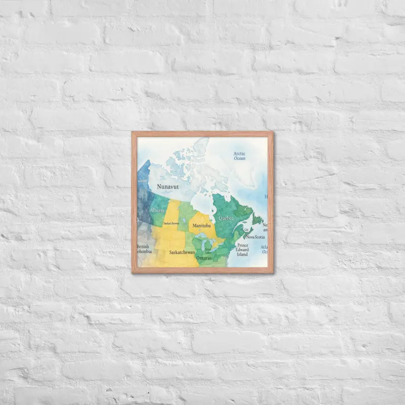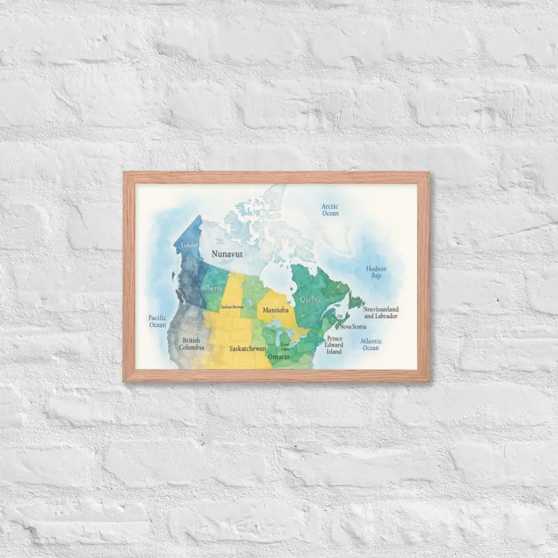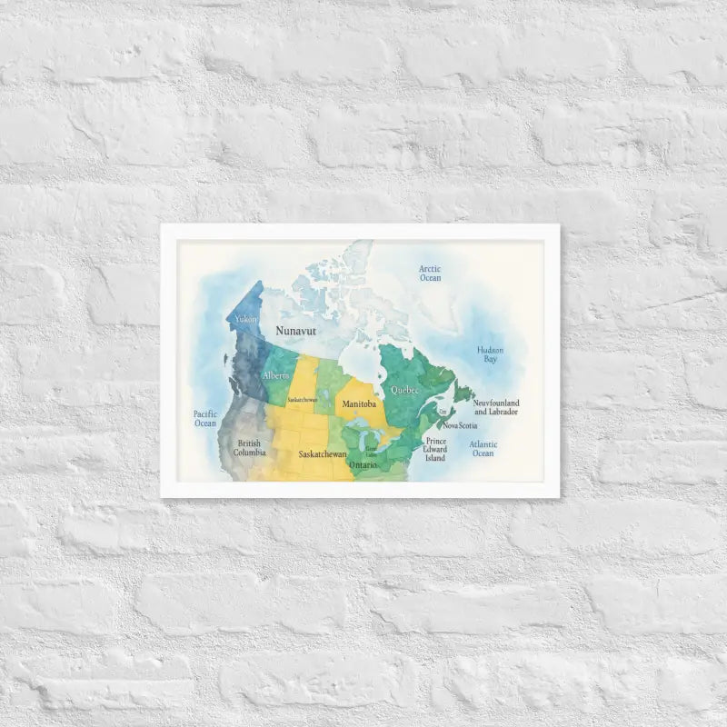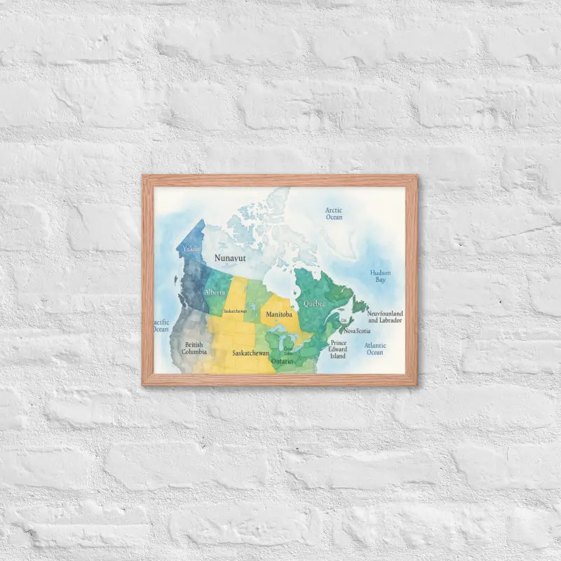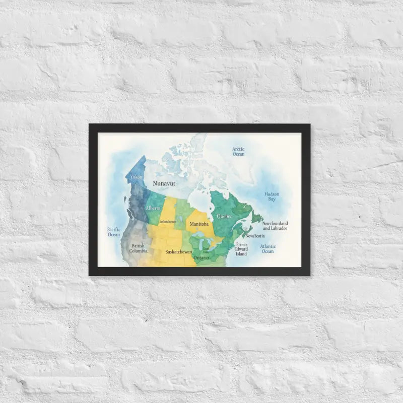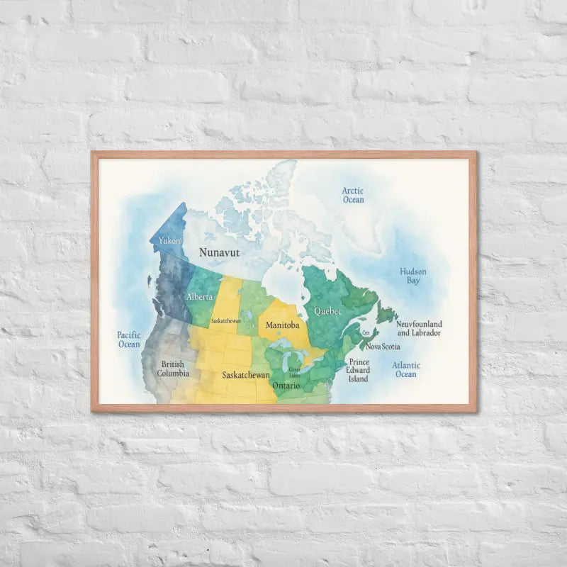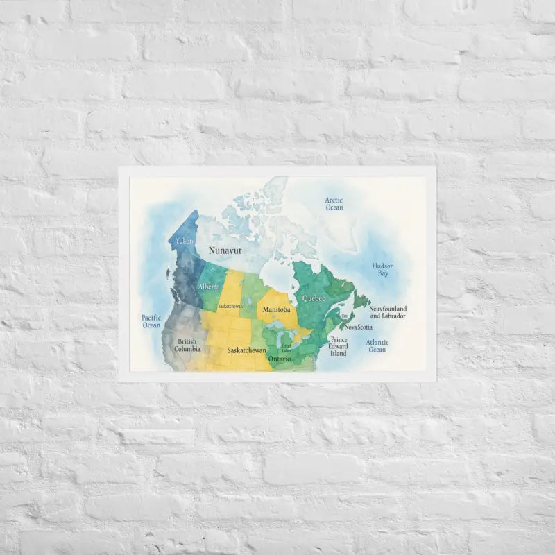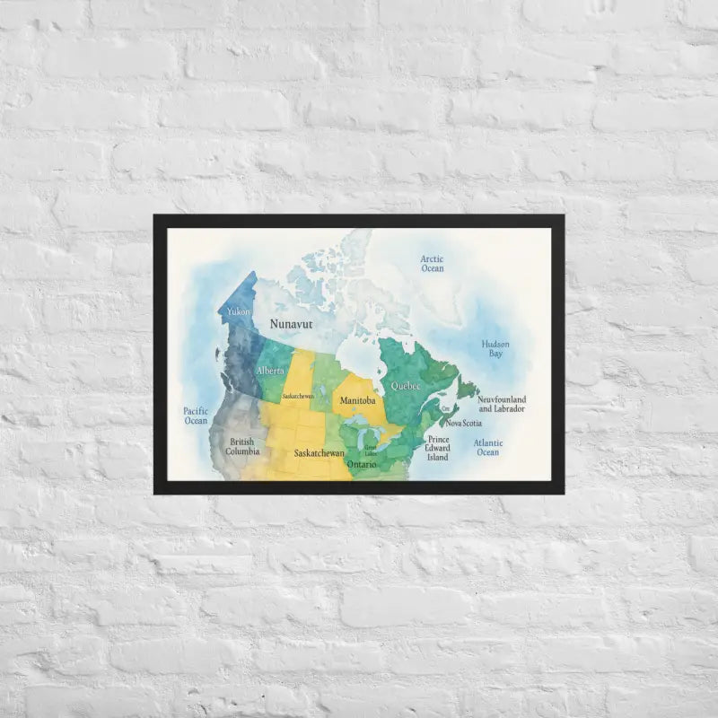 Bring the spirit of Canada to your walls with this vibrant watercolor map framed poster, where soft hues and detailed province names turn geography into art. Feel the calm of watercolor tones meeting the sleek elegance of a matte black frame.