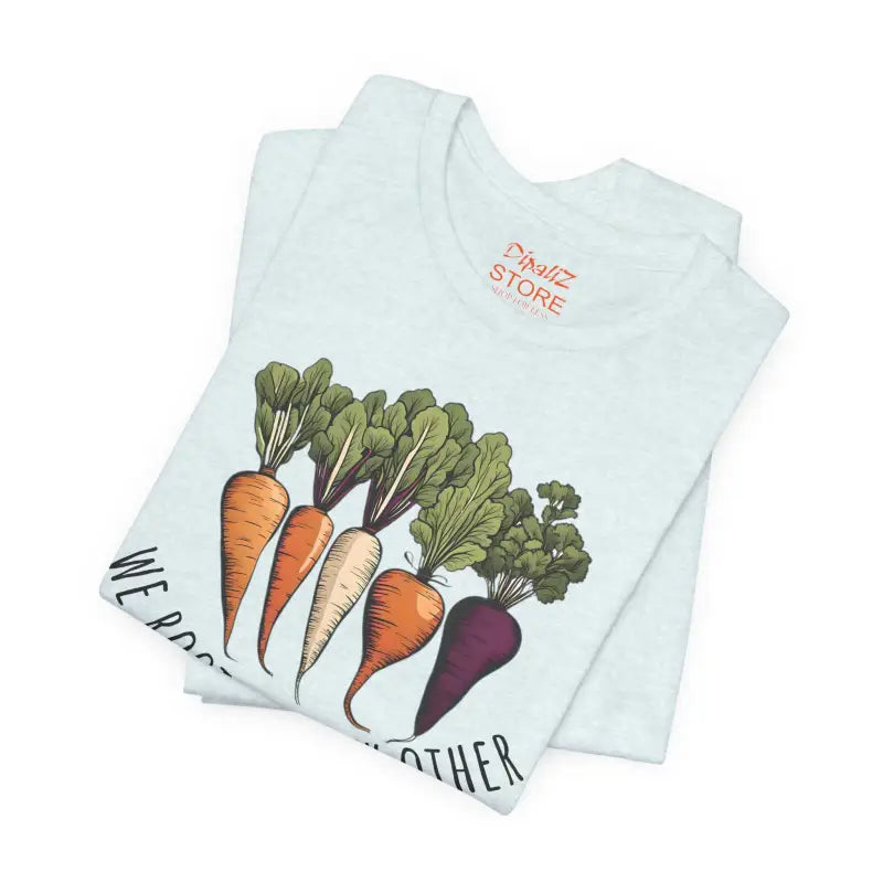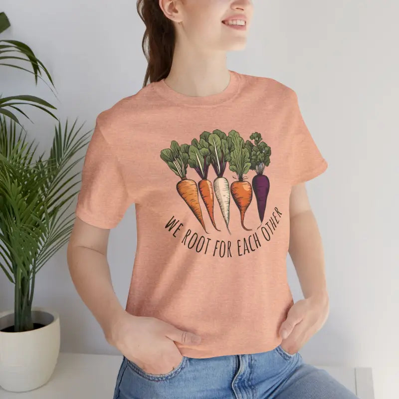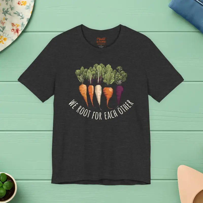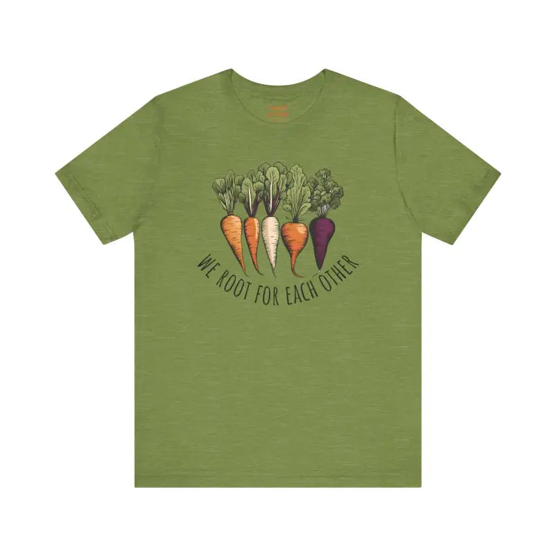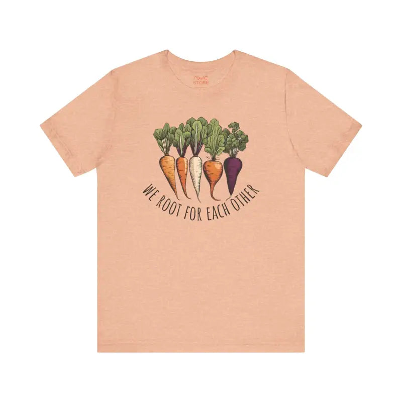 We Root for each other with root vegetables, Unisex Jersey Short Sleeve Tee. This classic unisex jersey short sleeve tee fits like a well-loved favorite. Soft cotton and quality print make users fall in love with it over and over again. These t-shirts have-ribbed knit collars to bolster shaping. The shoulders are tapered for a better fit over time. Dual side seams hold the garment's shape for longer.