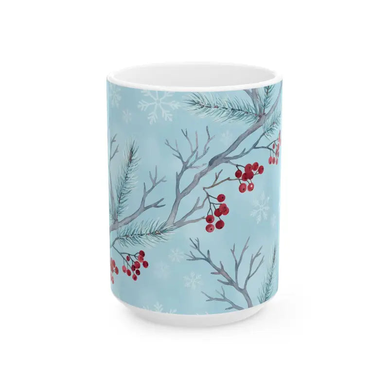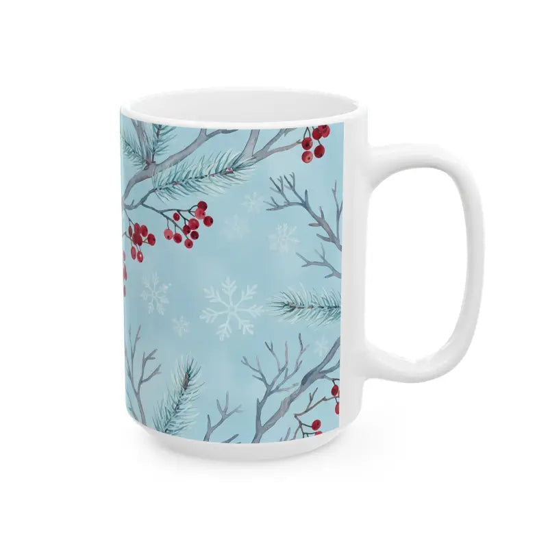 Picture yourself wrapped in your favorite blanket, watching the first snowfall while your hands warm around this gorgeous berry ceramic mug. The design wraps completely around the glossy white surface, creating an immersive winter wonderland that never ends. Against a dreamy pale sky-blue backdrop, soft snowflakes drift lazily past frosty pine sprigs heavy with clusters of brilliant red berries. The illustration flows seamlessly edge-to-edge, so every angle reveals a new detail of this peaceful winter scene. It's like holding a snow globe in your hands, except this one keeps your coffee piping hot and your cocoa perfectly cozy.