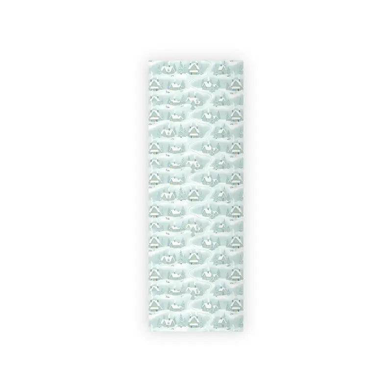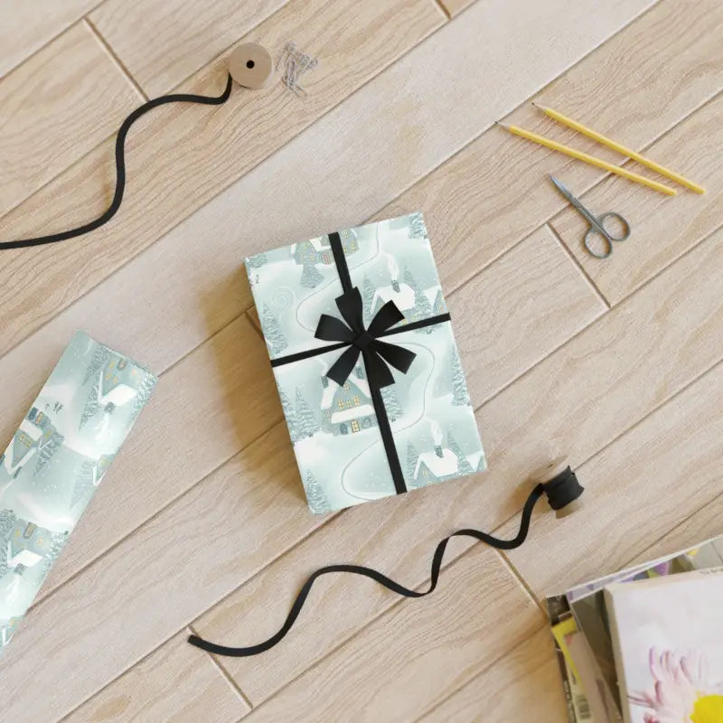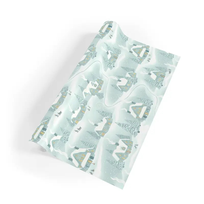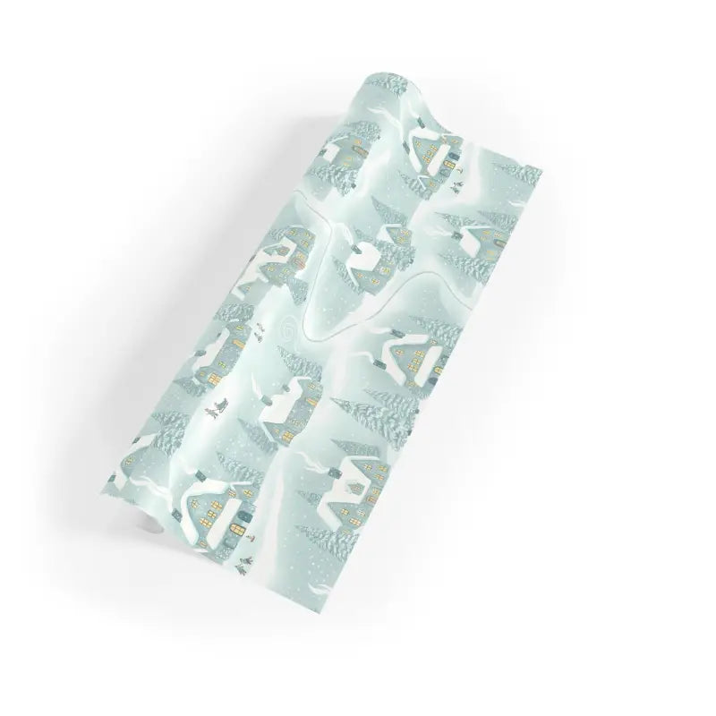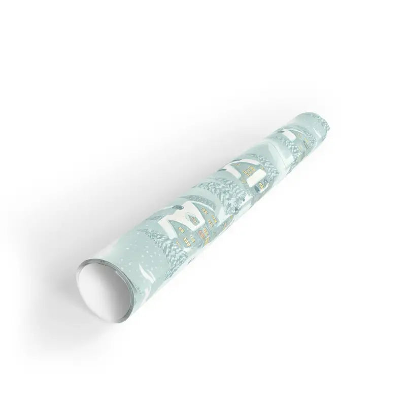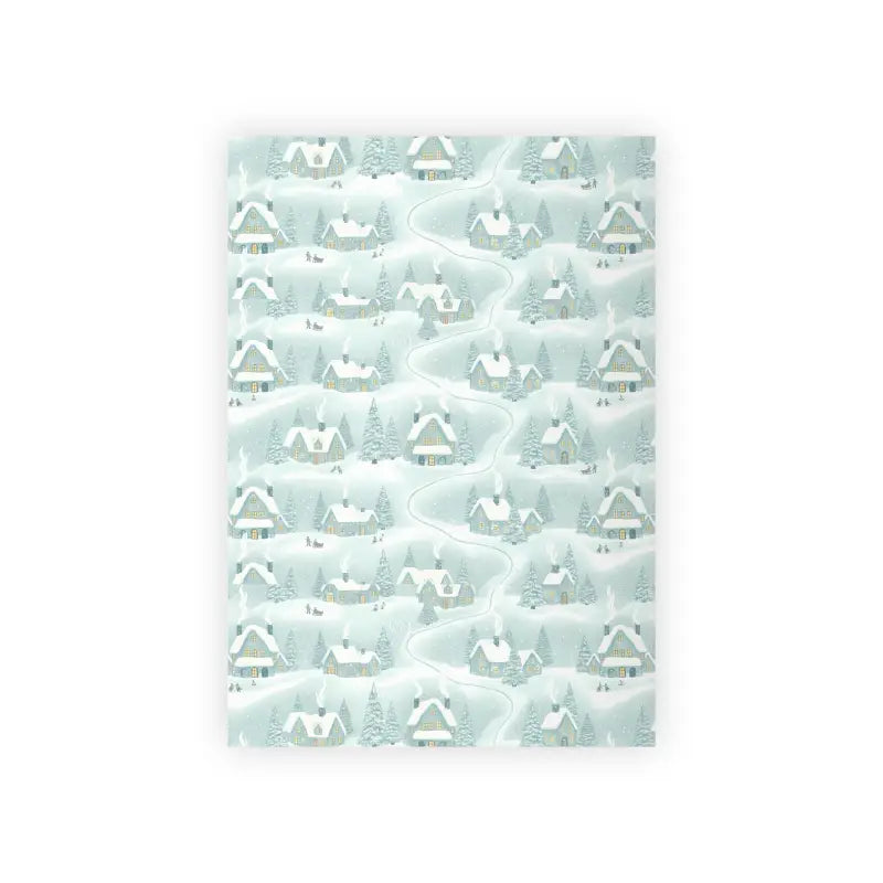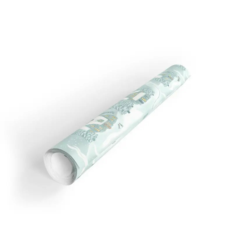 Delicate cottages dusted in mint and ivory swirl along a winding lane, evoking a peaceful snowy evening. The small-scale repeat pattern brings a sense of calm to gift giving, while the smooth art paper surface showcases every tag, ribbon, and handwritten note in crisp, full-color detail. Sustainably sourced materials ensure your holiday spirit stays focused on joy, not waste.