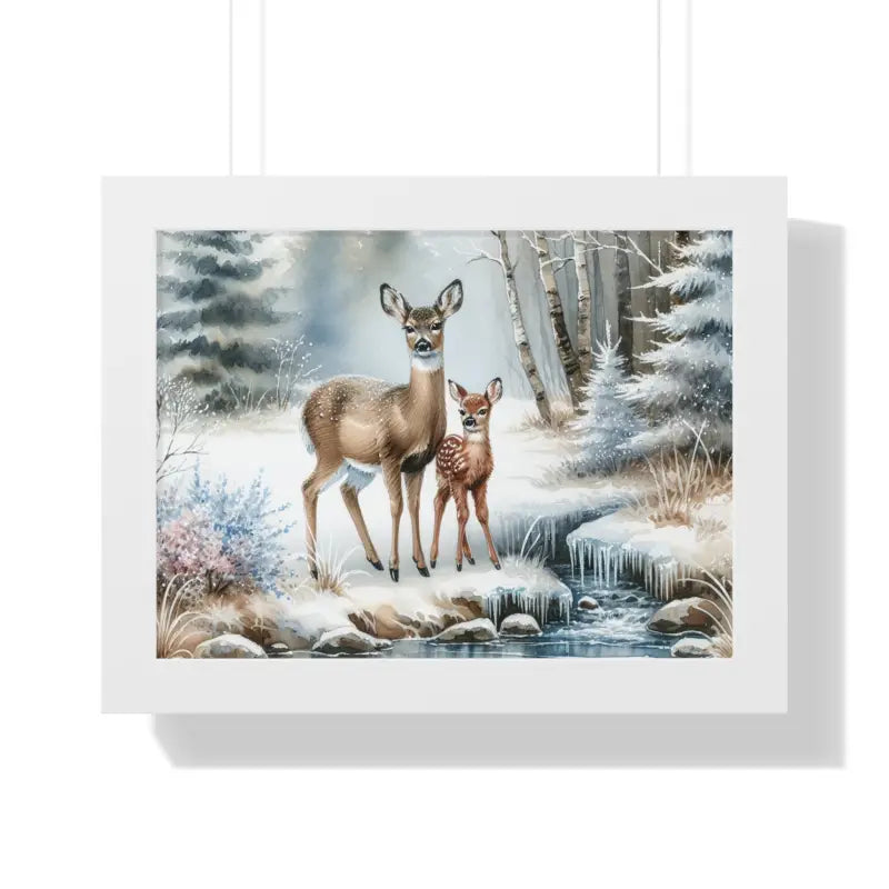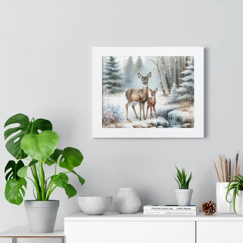 Print: Experience the magic of winter wildlife framed art with this horizontally oriented deer art print, capturing peaceful deer amidst frost and snow for an enchanting ambiance guaranteed to captivate art enthusiasts.