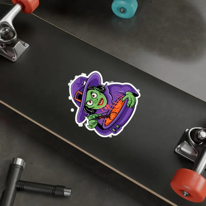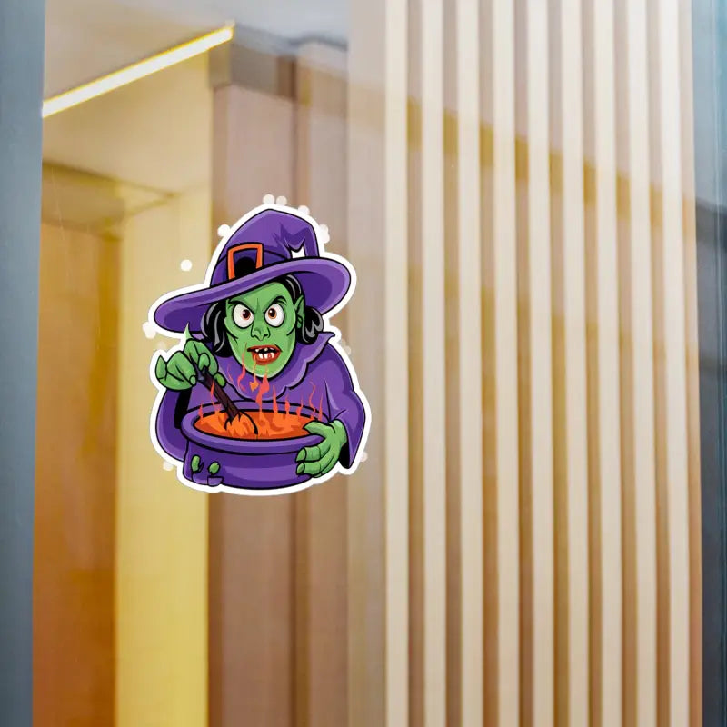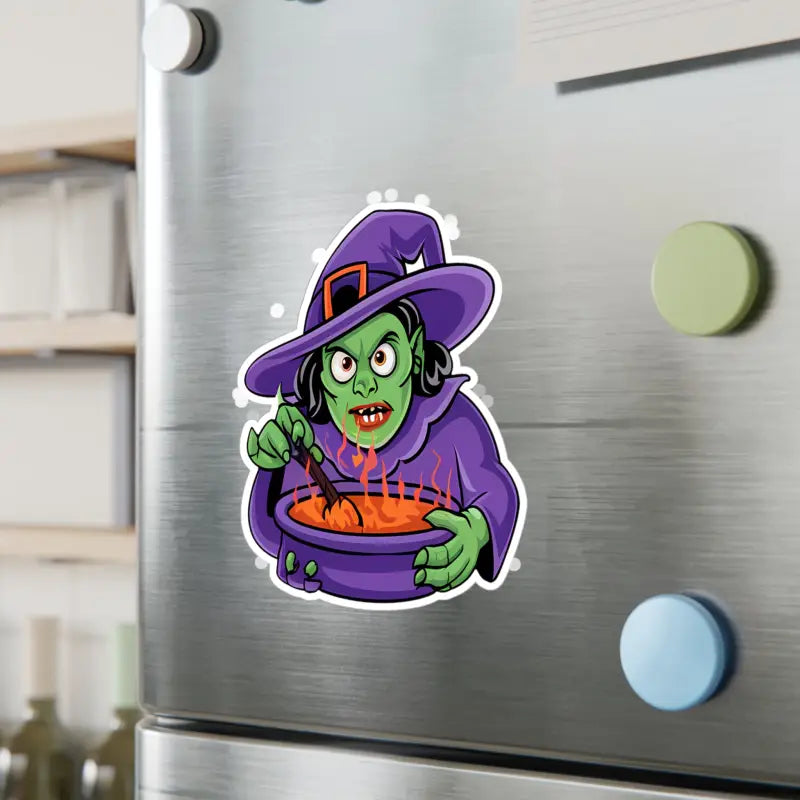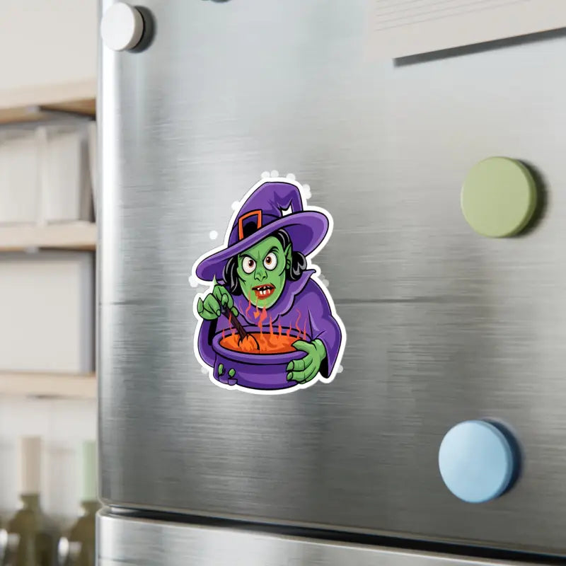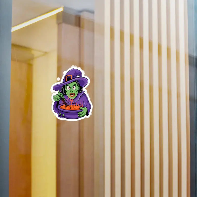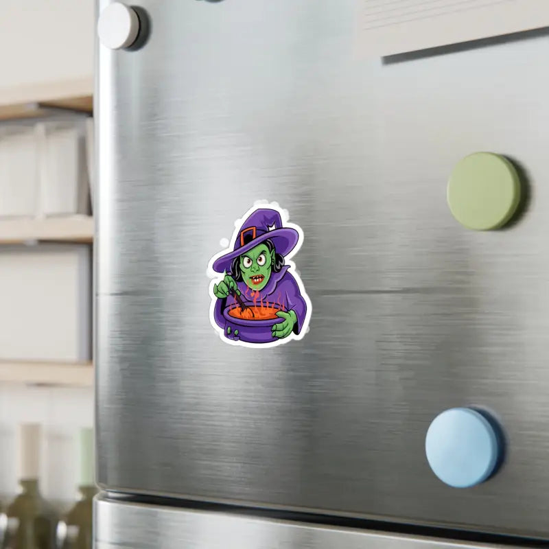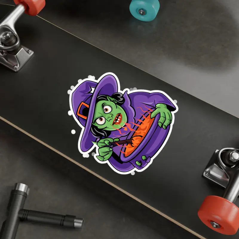 Print: Mesmerizing design of a witch conjuring her mystical brew in a cauldron, captured in vivid, durable white vinyl within a precise kiss-cut border for a sleek, satin finish.