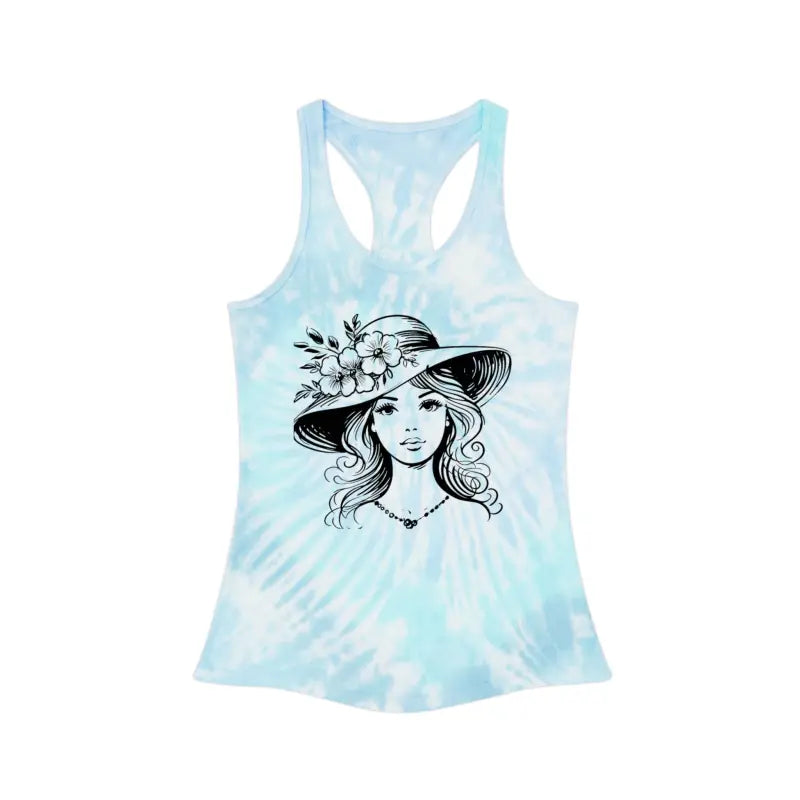 Unleash Your Style with the Women's Tie Dye Racerback Tank - Flower Hat Design