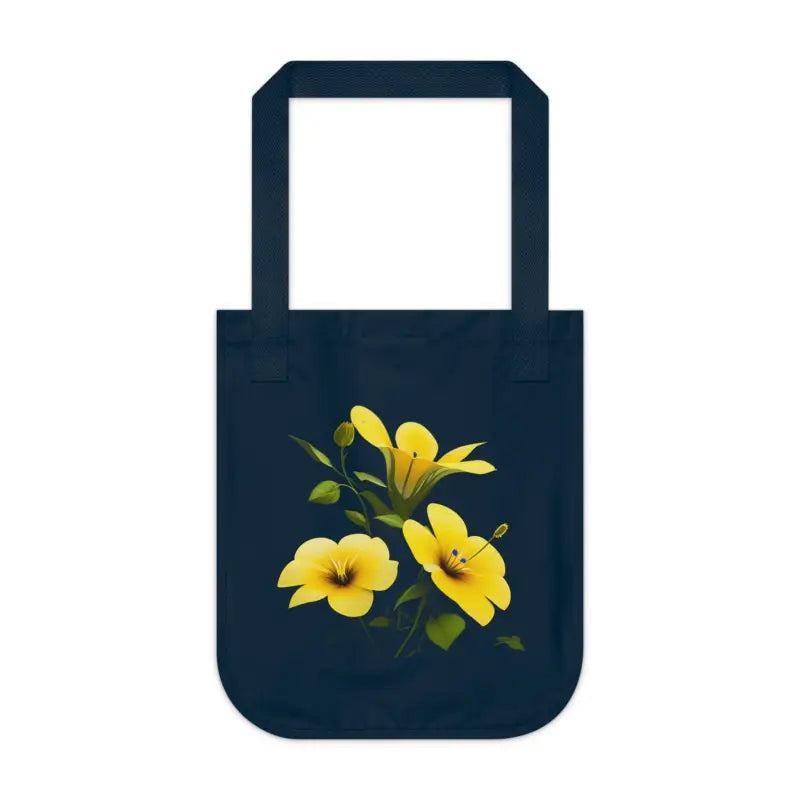 Print: Bright yellow trumpet flower design adds energy, personality, and natural charm to any outfit, making your organic canvas tote truly stand out.