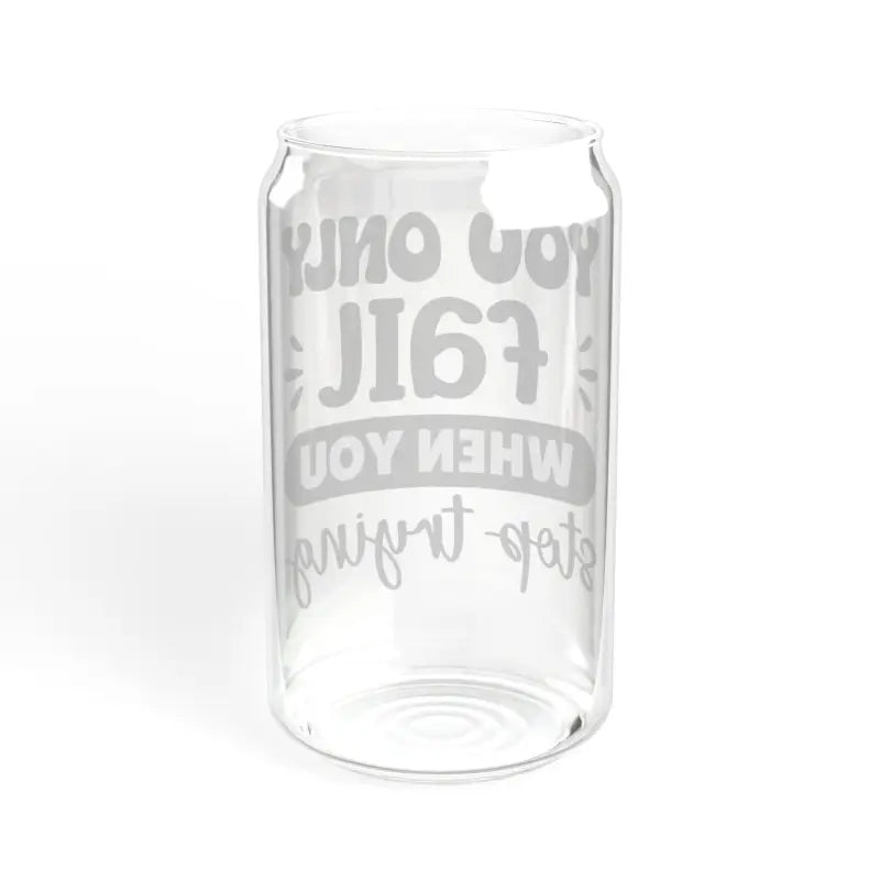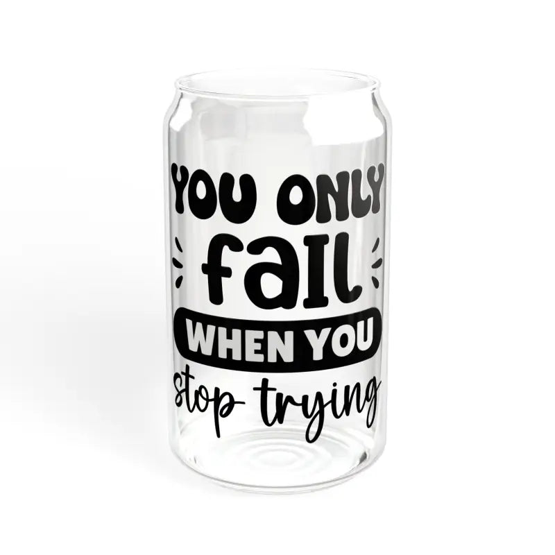 You only fail when you stop trying, BPA free, Sipper Glass, 16oz. Quench your thirst in style with our 16oz Sipper Glass. Made from clear tempered glass, it's durable, sleek, and perfect for refreshing cocktails, juices, or any beverage you fancy. Choose between the classic version or opt for the version equipped with a Gasket-push Bamboo lid and Tritan straw for added convenience. This sipper glass is FDA Certified, BPA Free, and Cal. Prop 65 compliant, ensuring your safety and peace of mind with every sip.